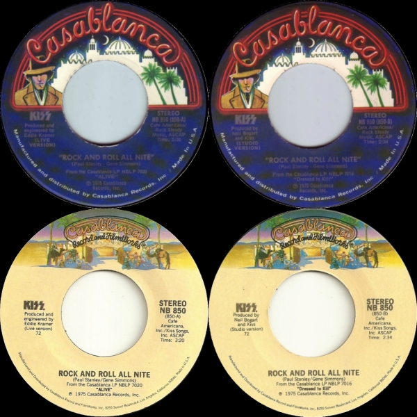 KISS's Alive! was at number 7, down one from the previous week and Earth, Wind & Fire's Gratitude moved up one place to number 16. Paul Stanley's intro is edited off the single for "Rock And Roll All Nite", on its way down the Forty-fives chart at number 32. My friend Charles had the 45 - or rather his older brother, Tony had it - and I remember it had a different Casablanca label than I would see later on my Donna Summer and Village People 45s. And it had the same song on both sides of the single, one the studio version from Dressed To Kill and the other the edited live version lifted from Alive! (My copy of the 45 is pictured at the bottom of the graphic below.)
